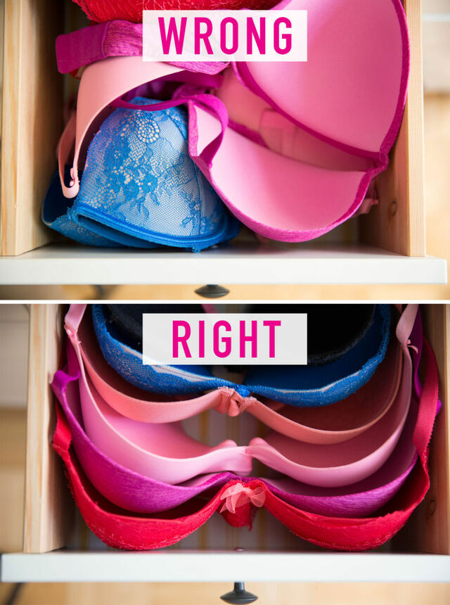 Dit zorgt ervoor dat de cups hun vorm verliezen. Leg ze daarom neer zoals in een lingeriewinkel, achter elkaar.
