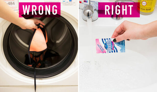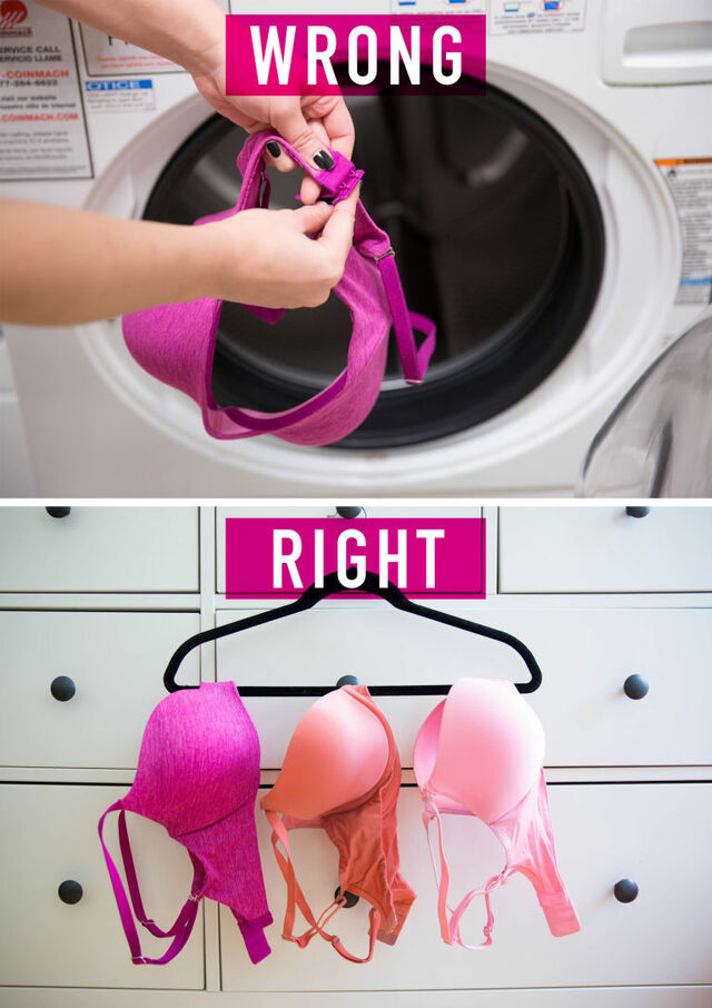 De hitte van de droger maakt het elastiek in de bh kapot. Laat je bh's daarom drogen over een hanger zoals op het onderstaande plaatje en niet aan de bandjes want dit zorgt ervoor dat ook deze uitrekken.