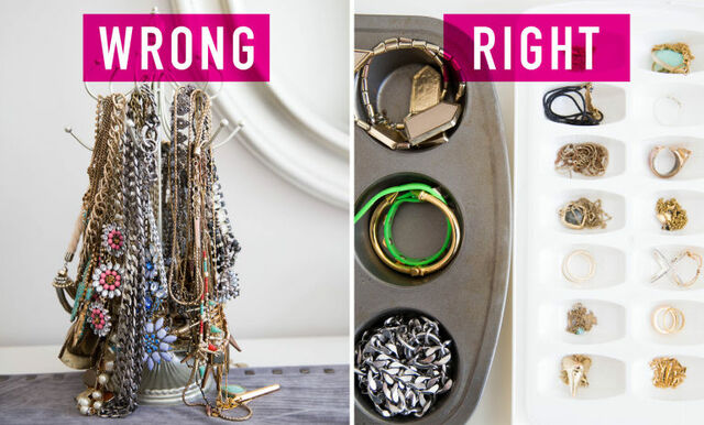 Bewaar de sieraden liever in kleine bakjes of mandjes, apart van elkaar zodat ze niet in de knoop raken en langer mooi blijven.