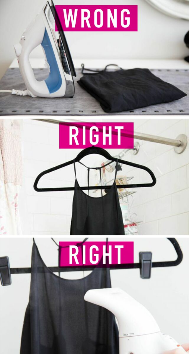 Een strijkijzer is vaak veel te heet voor dure dunne stoffen en kan beschadigingen achter laten alsje niet goed oplet. Hang ze daarom liever op in een steamy badkamer of breng ze naar de stomerij.