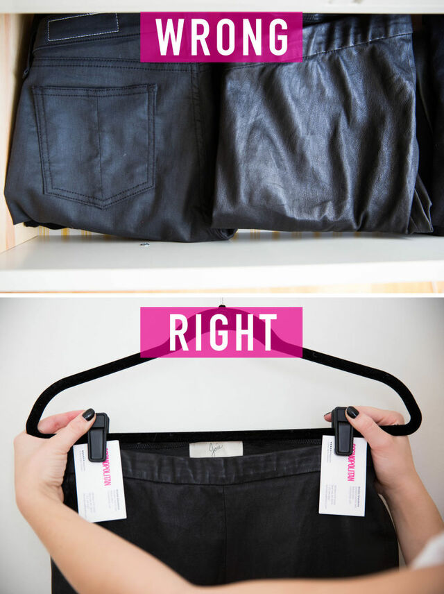 Dit zorgt ervoor dat er rimpels en vouwen in de broek (of ander lederen item) komen en dat is erg lastig om vanaf te komen omdat je lederen items niet kunt strijken of stomen. Daarom kun je beter de leren broeken ophangen, gebruik bijvoorbeeld visitekaartjes bij de clips om ervoor te zorgen dat er geen beschadigingen van de clips op je broek komen.