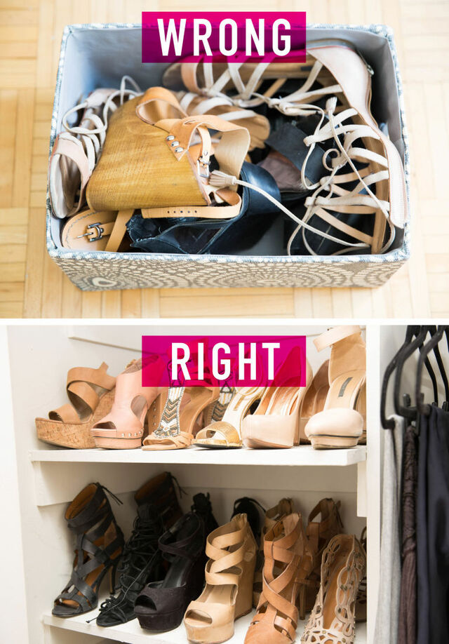 De beste manier om je schoenen netjes en in vorm te houden is om ze naast elkaar te bewaren op een schoenenplank of in een kast.