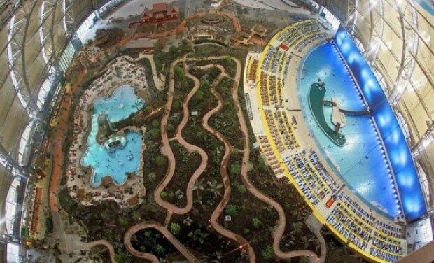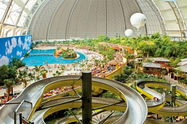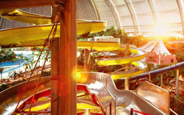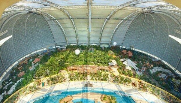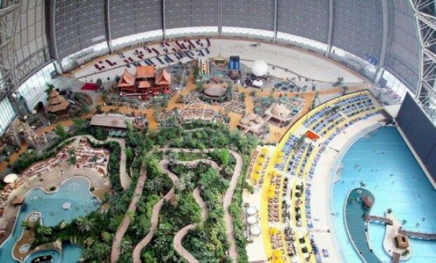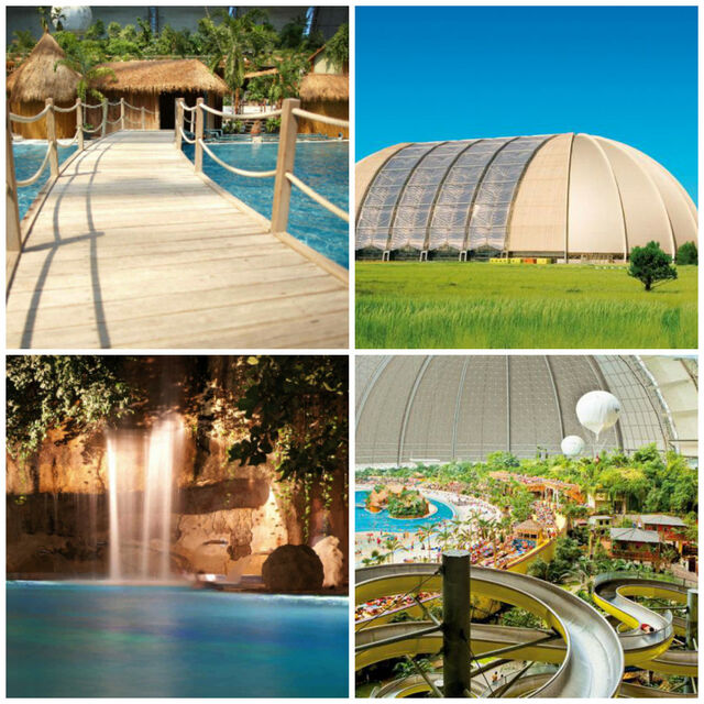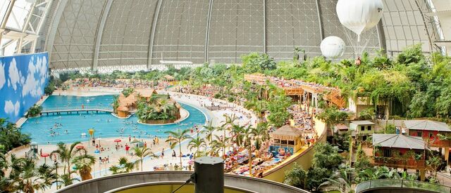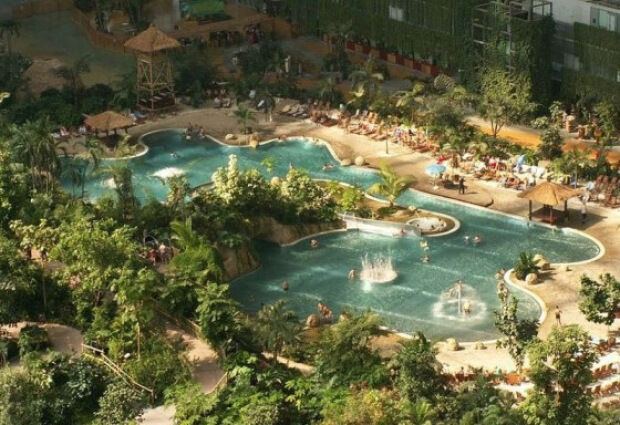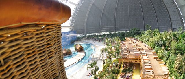 Een aantal jaren geleden heeft men in Krausnick in Duitsland een oude Zeppelin loods omgebouwd tot een tropisch paradijs. Het is zo'n zes uurtjes rijden vanaf de randstad (670km vanaf Utrecht), maar dan heb je ook wel wat: Een prachtig regenwoud, de tropische Zuidzee met 200m lang zandstrand, de lagune en whirlpools. De natuur is verbazingwekkend met een dichtbegroeide jungle, exotische plantsoenen en orchideeëntuinen. Een subtropisch dorp met huizen uit Thailand, Bali, Borneo, Polynesië, uit het Amazonegebied en Kongo. En dan hebben we het nog niet eens over de attracties (27m hoge glijbaantoren, stroomversnellingen, waterspeeltafels, minigolf en veel meer) gehad. Het klimaat is het hele jaar door ideaal (lucht 23 à 25°C, water 28 à 31°C). Mmmm!! Wij vragen ons maar één ding af: waarom wisten wij dit niet eerder?