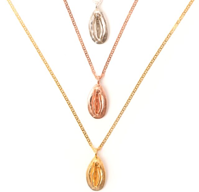 Van een afstandje lijkt de ketting met gouden hanger ontworpen door designer Suzzan Atala op een walnoot of misschien zelfs de op de scharen van een krab, maar wanneer je dichterbij kijkt zie je wat het daadwerkelijk is. Een vagina.