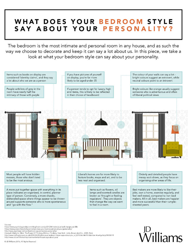De onderstaande infographic gemaakt door kledingmerk JD Williams gaat hier op in, en laat bijvoorbeeld zien dat bloemen, lampen en kaarsen je gedachtes en gevoelens regulieren. Wat we misschien wel al wisten, is dat onderzoek aantoont dat mensen met fel gekleurde muren meer neigen naar een extravert karakter, terwijl mensen die ervoor kiezen om hun muren rustig te houden meer een introvert karakter hebben.