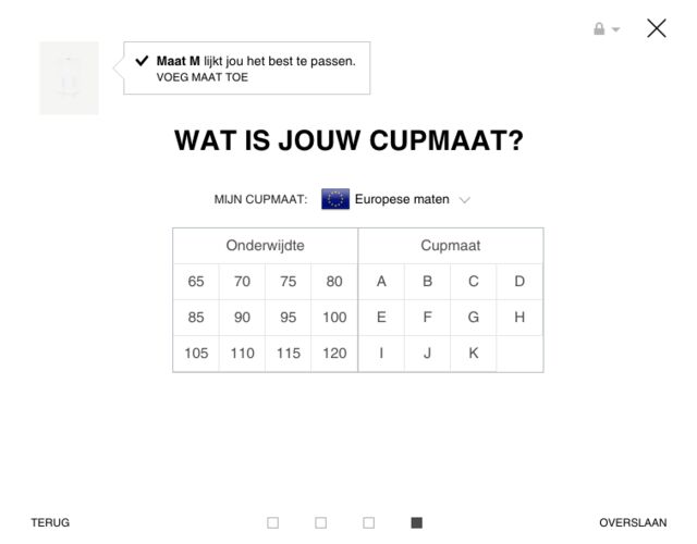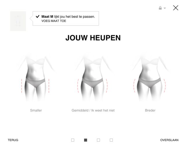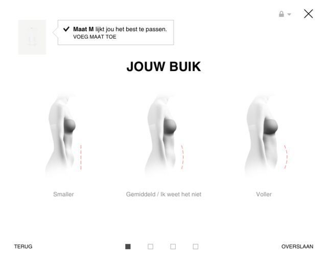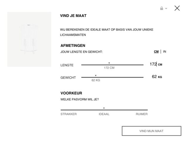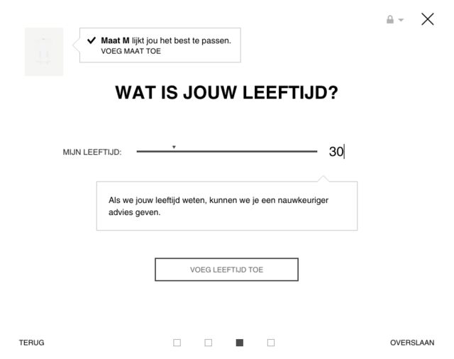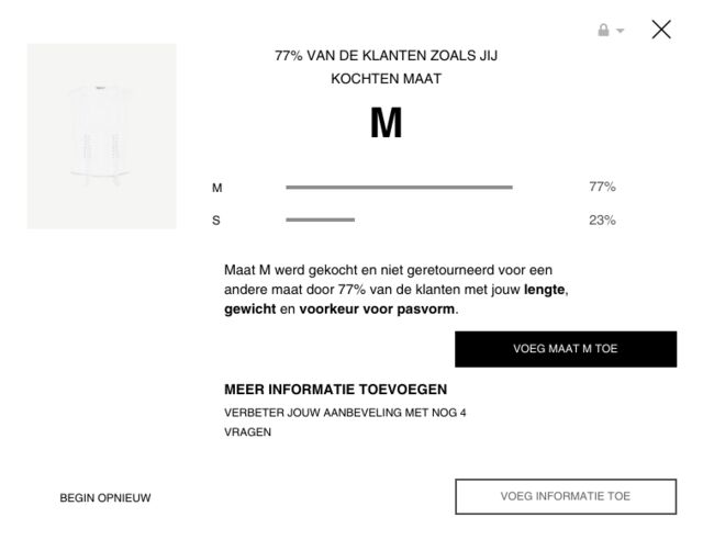 In eerste instantie hoef je alleen je lengte en gewicht in te vullen en of je het item normaal, strakker of wat los wilt dragen. Aan de hand daarvan beslist Zara in snel welke maat het beste bij jou past. Maar wat als je nou een grote boezem, smalle heupen of een wat bollere buik hebt dan gemiddeld? Ook daar heeft Zara aan gedacht met aanvullende opties bij 'meer informatie toevoegen'. Ook wordt rekening gehouden met je leeftijd.