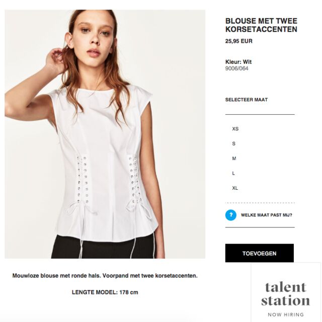Daar heeft Zara nu een oplossing voor! Als je bij een item (dat in verschillende maten verkrijgbaar is, one size items dus niet) klikt op de tekst 'welke maat past mij' naast het blauwe vraagteken, dan gaat Zara voor jou uitzoeken wat de perfecte size is die je moet bestellen.