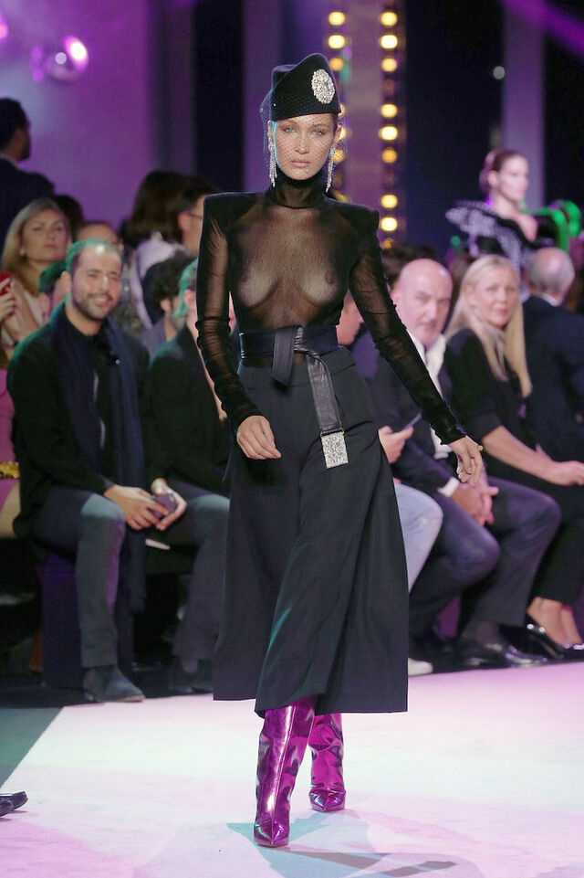 De tweede look van Bella Hadid voor Alexandre Vauthier was misschien nog wel gewaagder dan de eerste. In een doorschijnende strakke top, met schoudervullingen, had de toeschouwer op de front row prima zicht op de borsten van het model. Het gezicht van Bella was verborgen achter een netje, maar haar scherpe neus en karakteristieke jukbeenderen piepten mooi onder het baretachtige hoedje uit.