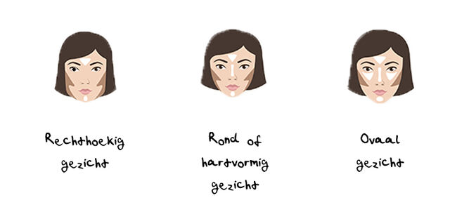 Rond of een hartvormig gezicht? Creëer een strakke kaaklijn door vanaf de kin langs je kaak te contouren. Contour ook je jukbeenderen en de zijkanten van het voorhoofd. Highlight de brug van je neus door middel van de lichte kleur en doe hetzelfde met het midden van het voorhoofd en de kin.