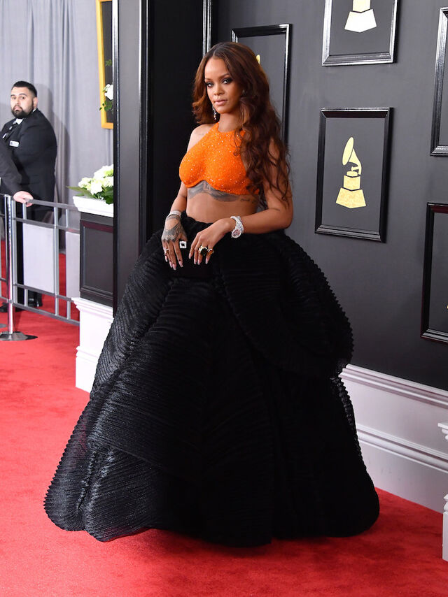 Rihanna is magisch. Het maakt niet uit wat ze aantrekt, ze ziet er altijd prachtig uit. Gekleed in Armani Privé droeg de 28-jarige zangeres een oranje met steentjes bewerkte sport BH en een grote, dramatische zwarte rok. Een smokey eye met diepzwarte eyeliner en nude lips accentueren haar prachtige lichte ogen. Rihanna was genomineerd voor acht Grammy's en ging met legen handen naar huis, maar de zangeres straalde niet minder en had nog steeds de tijd van haar leven.