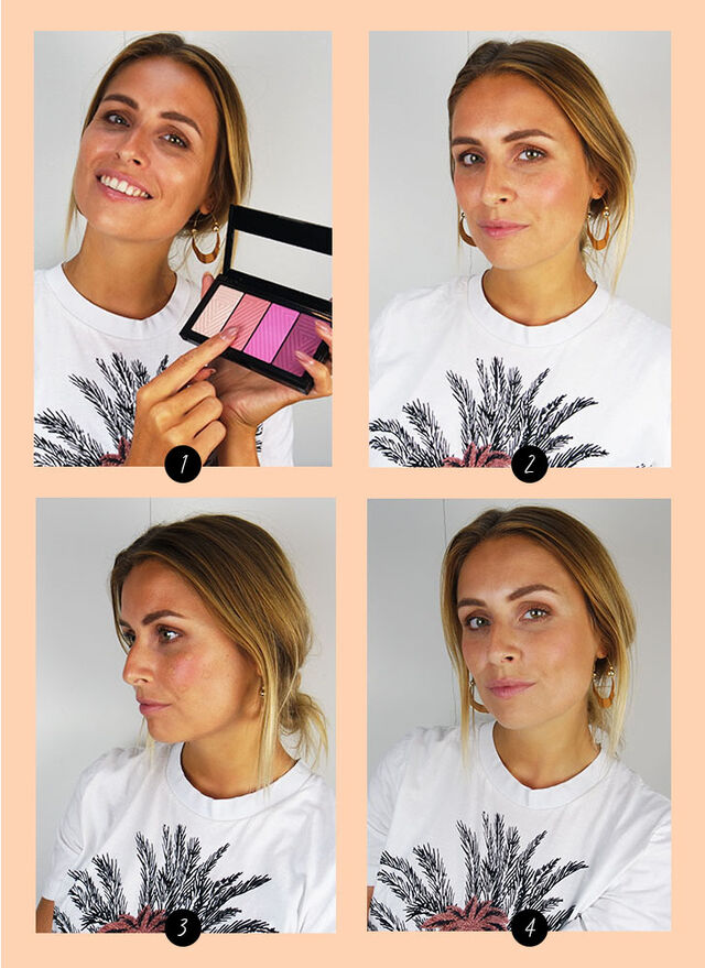 We dagen je hier uit om de vertrouwde volgorde van jouw make-up om draaien. Je breng namelijk eerst blush aan, bijvoorbeeld met het Master Blush palette (1 en 2) en vervolgens foundation. Dit doe je door op de 'randen' van de blush stipjes foundation te zetten (3) en vervolgens ga je dit blenden met een foundation kwast of je vingers. Waarom zou je het zo doen? Doordat je eerst blush aanbrengt en vervolgens met foundation blendt, schijnt de blush als het ware door de foundation heen en lijkt de frisse blush op je wangen onderdeel van je huid (4)! Oh-zo naturel..