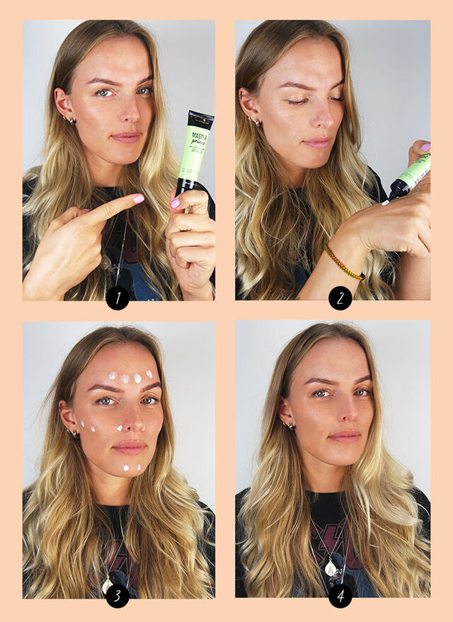 Wist je dat er ook kleur corrigerende primers zijn? De Master Prime Anti-redness primer (1) geeft je een mooie en egale huid én het camoufleert roodheid. De primer is groen van kleur, maar daar merk je niets meer van zodra je het uitsmeert. Breng een klein beetje aan op de rug van je hand (2) en dep de primer vervolgens op je gezicht. Je kunt hem over je hele gezicht aanbrengen of alleen op de rode plekjes, zoals je neusvleugels (3). Het resultaat? Een mooie egale huid (4).