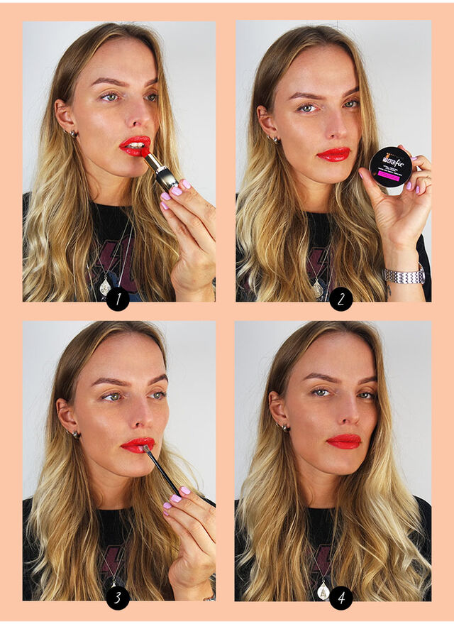 Oeps! Je hebt een lipstick aangebracht die veel te glossy is (1) en je zou liever voor een matte lip look gaan. Geen paniek. Het enige wat je nodig hebt is Master Fix setting + perfecting loose powder (2). Gebruik een klein kwastje, doop deze in de losse poeder en dep het voorzichtig op je glanzende lipstick (3). Ga door totdat je tevreden bent met het resultaat (4). Appeltje, eitje!