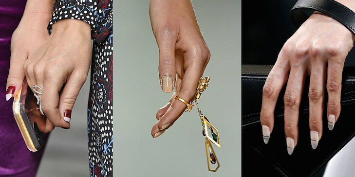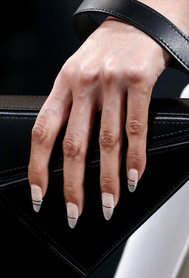 Geweldig bij lange, ovale nagels! Bij Cushnie et Ochs spotten we neutrale nagels met een klein sprankelend detail: een super smal horizontaal lijntje langs de natuurlijke lijn van het vingertopje.