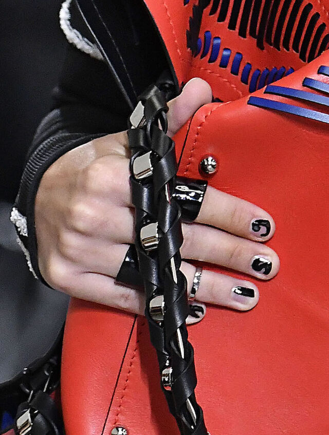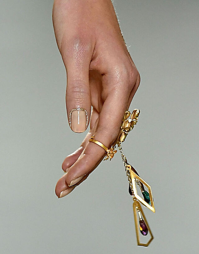Bij Rodarte gingen ze aan de slag met 'nagelriem juwelen'. Ook doen? Breng met een smal kwastje een beetje goudkleurige glitternagellak aan op je nagelriemen.