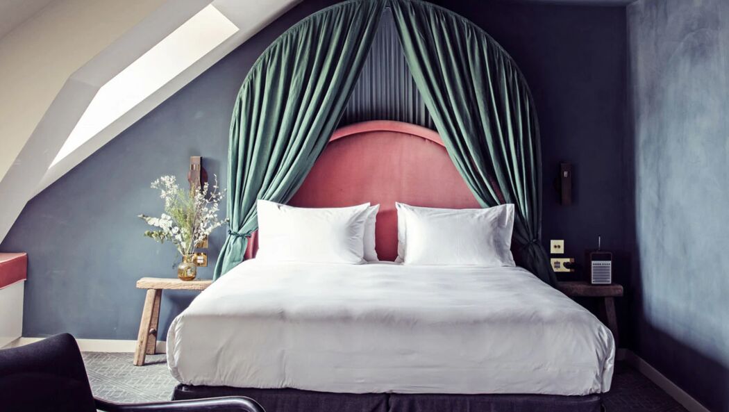 Dit is natuurlijk het belangrijkste onderdeel van de kamer. Ga voor een zo groot mogelijk exemplaar voorzien van een mooi hoofdbord (het liefst uitgevoerd in een luxe stof als velours). Boxsprings genieten de voorkeur. Voorzie het bed van mooi bedlinnen - Crisp Sheets is bijvoorbeeld één van onze favorieten. Je zou denken dat je flink wat kussens op bed moet plaatsen maar twee per bed (dus vier voor een tweepersoonsbed) is voldoende. Nadat je in het bed geslapen hebt, vouw je de dekens netjes open zodat je bed eventjes 'kan luchten'. Daarna plaats je de deken weer volledig over het matras en zet je de twee kussens rechtop tegen elkaar aan tegen het hoofdbord. Breng eventueel een kleine deuk aan in het midden door er zachtjes op te drukken.
