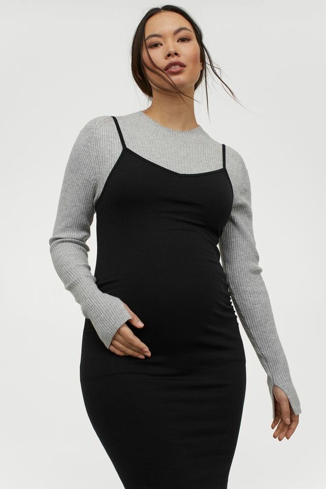 Laat je baby bump aan iedereen zien met een strakke jurk met spaghettibandjes. Combineer het met een leuke geribde trui zoals op onderstaande foto.