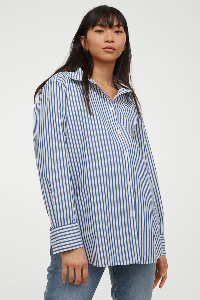 Deze overhemdblouse met horizontale strepen is een keer wat anders dan een jurkje. Je zal er bij lopen als een modieuze Française.