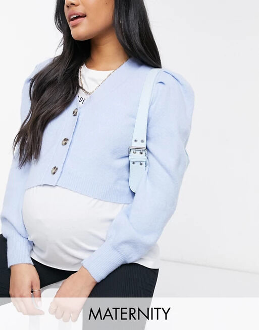 Korte vestjes met opvallende knoopjes zijn populair. Combineer dit pastelblauwe vestje met pofmouwtjes met een lichtgeel item. Dan vink je gelijk drie trends af!