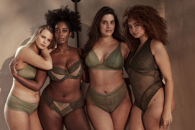 Het lingeriemerk vindt niet alleen alle lichamen belangrijk, Hunkemöller maakt ook stappen in de juiste richting als het gaat om het gebruiken van duurzame materialen. Een voorbeeld is kant van gerecycled nylon dat is verwerkt in de stijlen Lenix en Rabella. Bewonder hieronder de Rabella setjes in twee verschillende prachtige tinten groen!