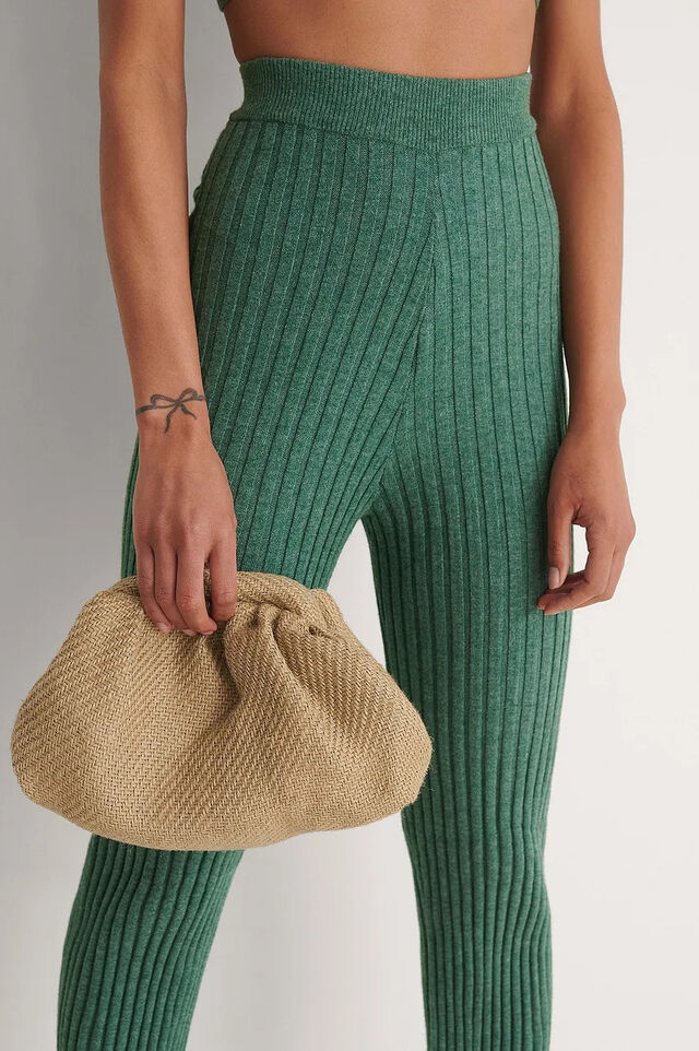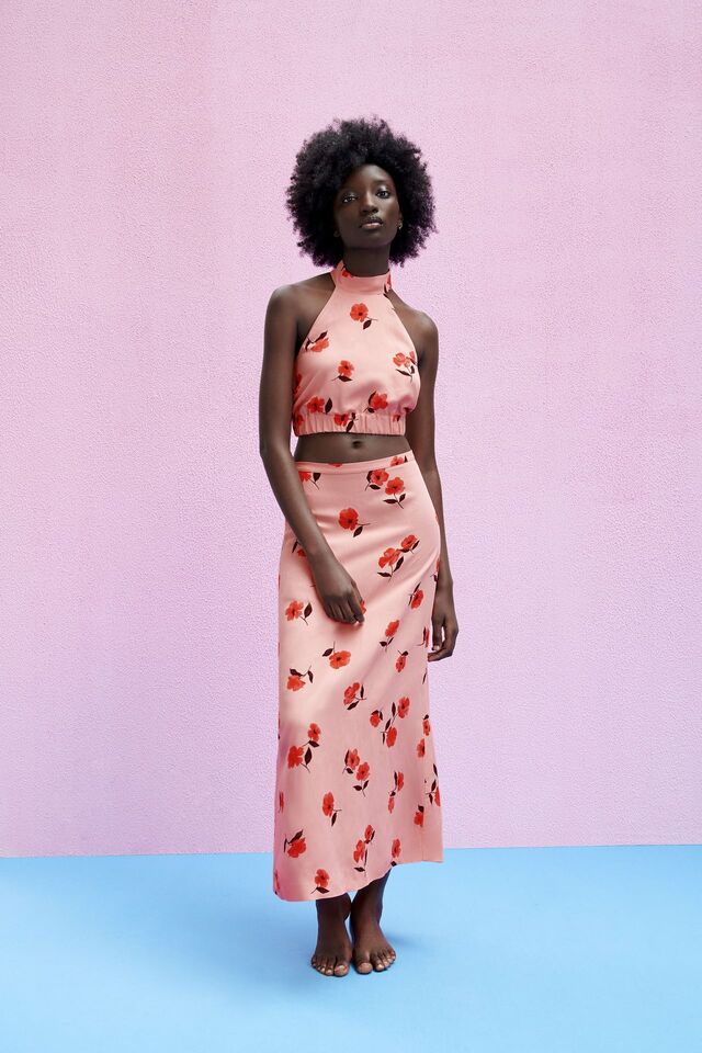 Een gebreide haltertop, een midirok met bloemenprint en een tasje van stro is alles wat je nodig hebt voor een geweldige bruiloft outfit.