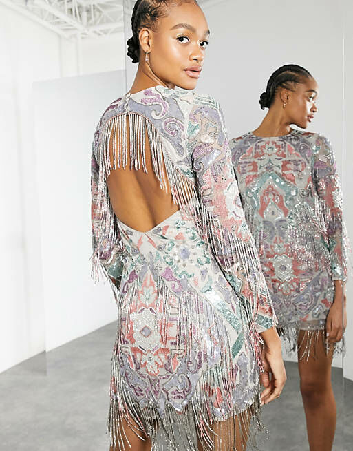Geborduurde mini-jurk met abstracte kralen en franje bij Asos.com