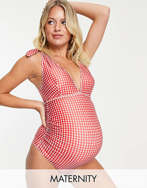 Badpak met decolleté en ruches in rode bloemenprint bij Asos.com