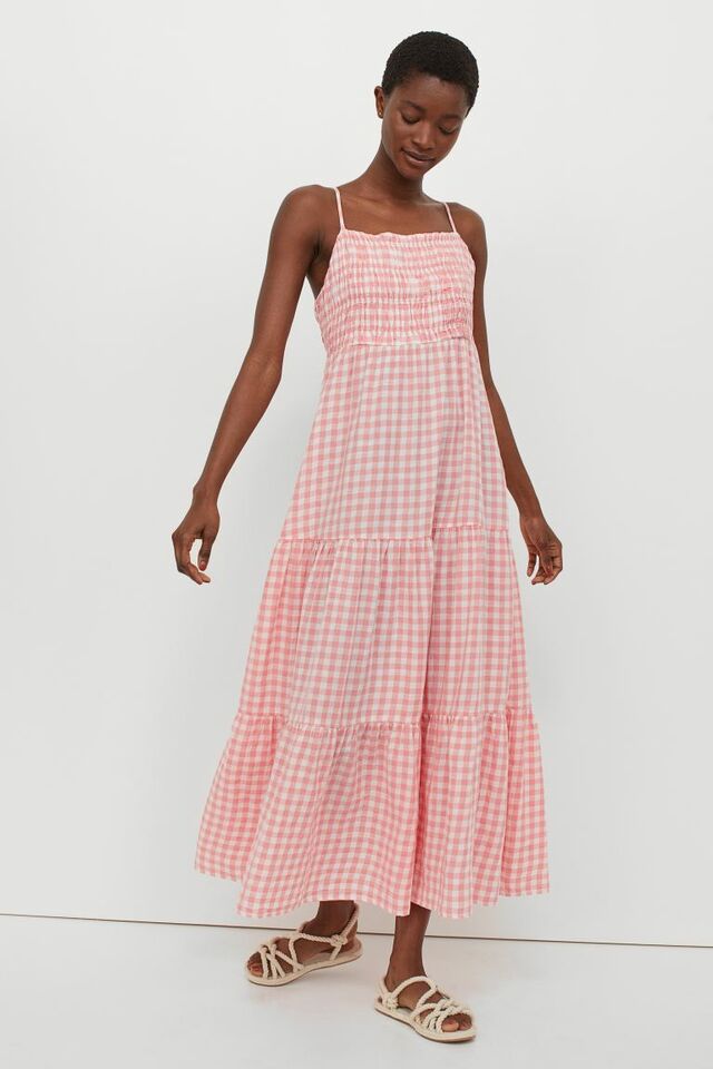 Lange jurk met smokjurk in lichtroze geruit bij Hm.com