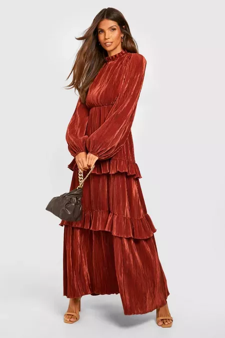 Bordeauxrood is een échte herfstkleur, dus wanneer dit binnen de dresscode valt is dit een goede optie voor jouw outfit. Een vestje is niet altijd nodig bij zo'n jurk, want de jurk heeft meerdere laagjes en een hoge hals.
