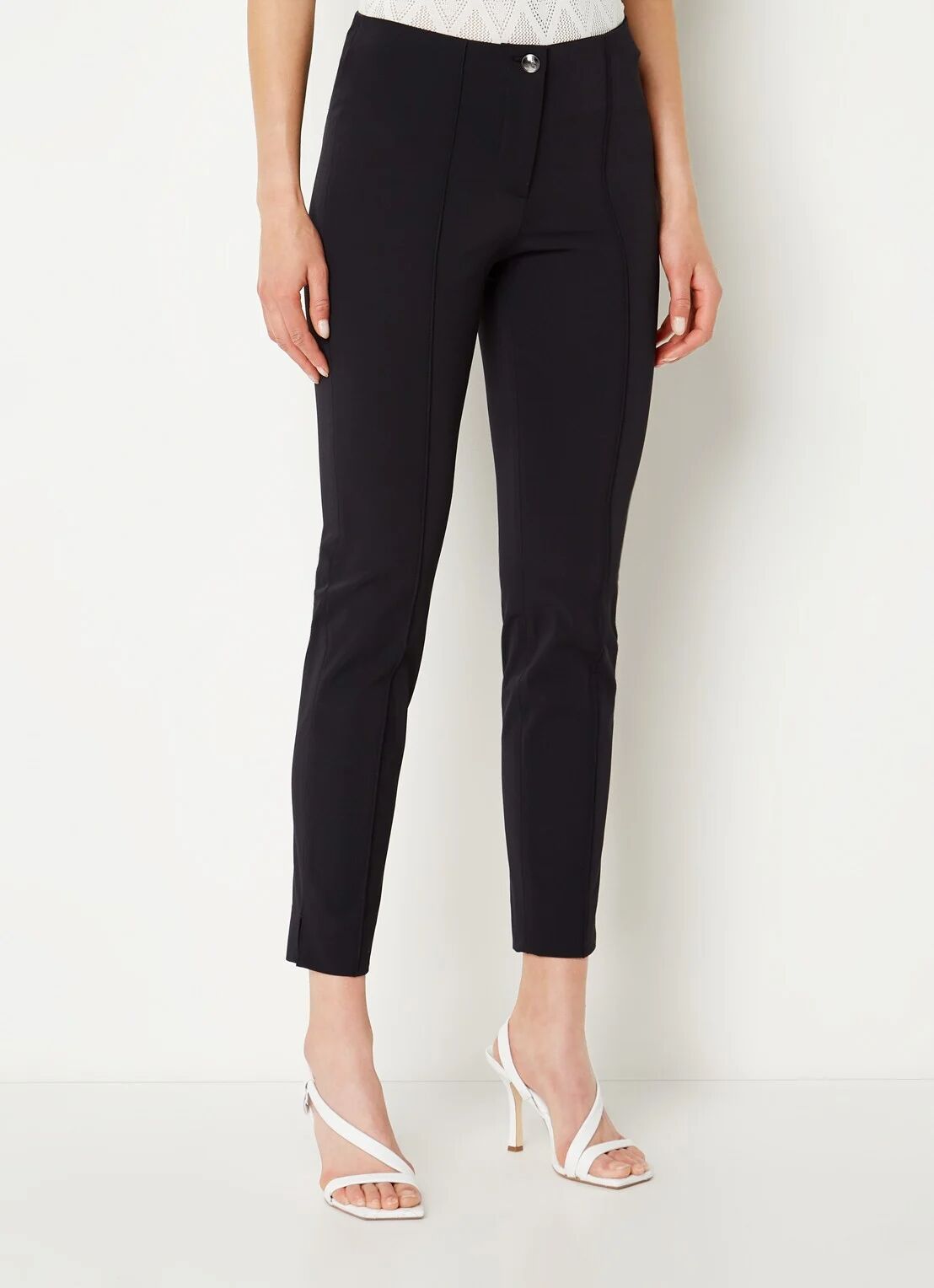 Tot slot gaan we even back to basics. Voor de liefhebber van een simpele zwarte pantalon hebben we deze slim fit broek van Claudia Sträter. Deze pantalon van travelstof is mid waist en cropped bij de enkels. Hierdoor kun je hem mooi combineren met een paar laarsjes, of in de warmere seizoenen juist met een paar sneakers. Omdat deze pantalon een slim fit model heeft, kun je deze voor een contrasterende look combineren met een oversized blazer.