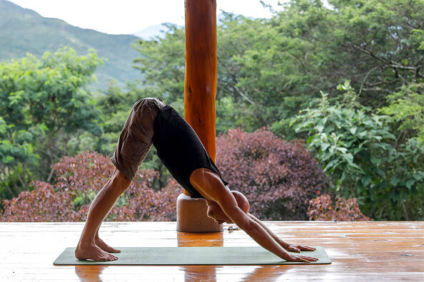 Zet je handen en voeten stevind op de grond en duw de heuepen en billen omhoog in een hoek van ongeveer 90 graden. Houd het hoofd laag en blijf naar je voeten kijken. Houd deze positie drie minuten vast, terwijl je geconcentreerd in- en uitademt.