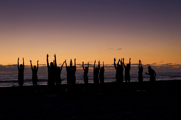 We beginnen met de simpelste positie; de berghouding. Adem diep in, zwaai je armen zo ver mogelijk omhoog en raak je handen aan. Strek alles in je lichaam, recht je rug en kijk omhoog. Houd dit zo'n tien tot dertig seconden vast, of tot je het gevoel hebt dat je lichaam voldoende gestrekt is.