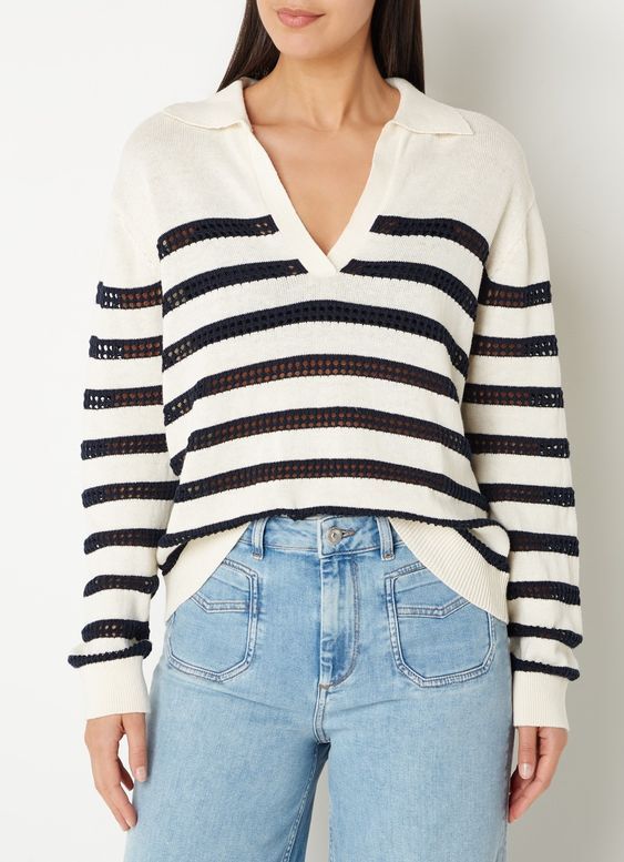 Een gebreide trui is altijd fijn om in je kast te hebben. Dit model met v-nek en horizontale streepjes is momenteel helemaal in. Maar wat ons betreft is dit item ook tijdloos. Wit met zwarte strepen kan altijd! Combineer de trui met je favoriete jeans en sneakers voor een relaxte look.